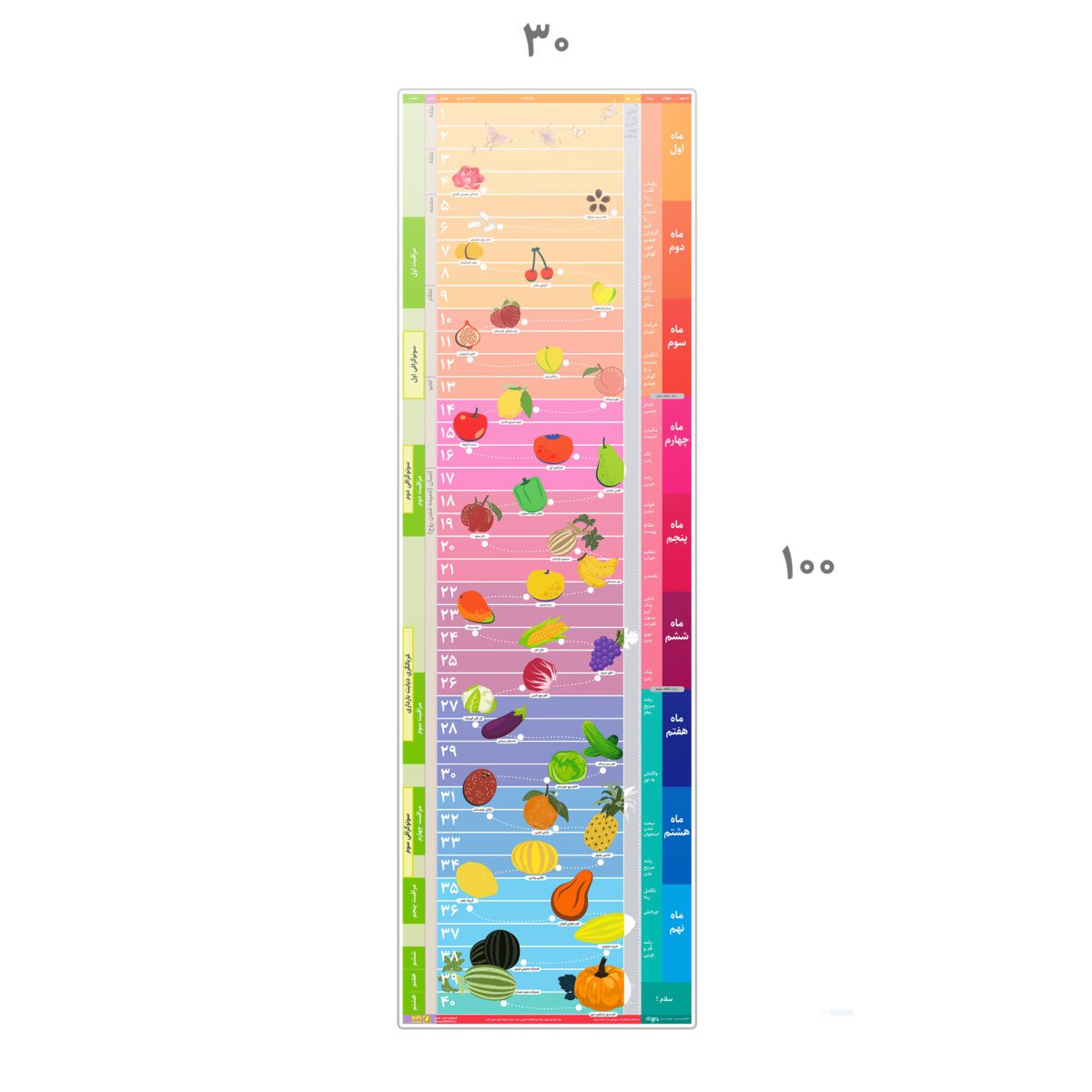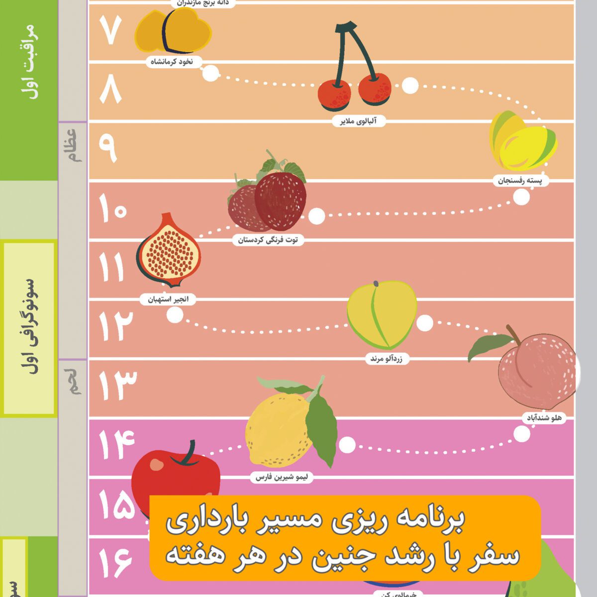 بدانید در کدام هفته بارداری قرار دارید. ماه ها با رنگ بندی متفاوت مشخص شده اند